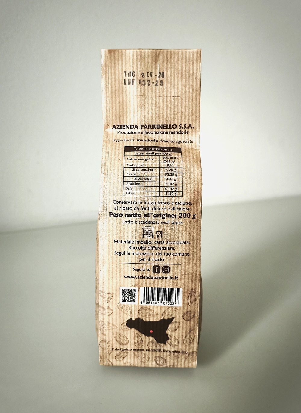 La mandorla, appena raccolta, viene immediatamente smallata e posta ad asciugare per ridurre al minimo il rischio di formazione di micotossine. Successivamente viene privata del guscio, calibrata e selezionata per avere una mandorla intera dal calibro 36+.