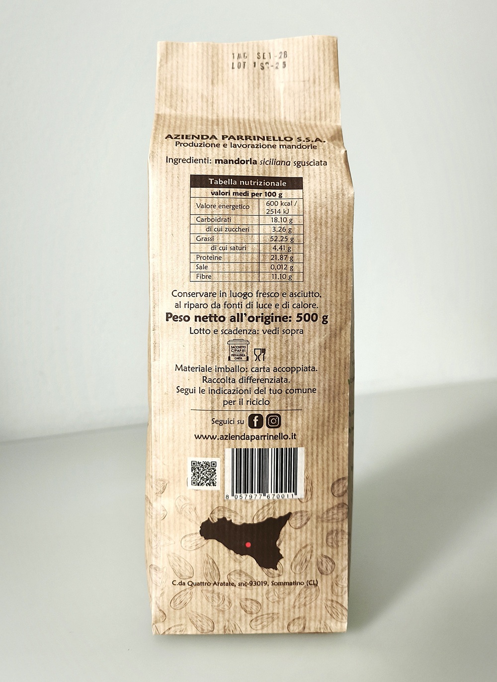 La mandorla, appena raccolta, viene immediatamente smallata e posta ad asciugare per ridurre al minimo il rischio di formazione di micotossine. Successivamente viene privata del guscio, calibrata e selezionata per avere una mandorla intera dal calibro 36+.
