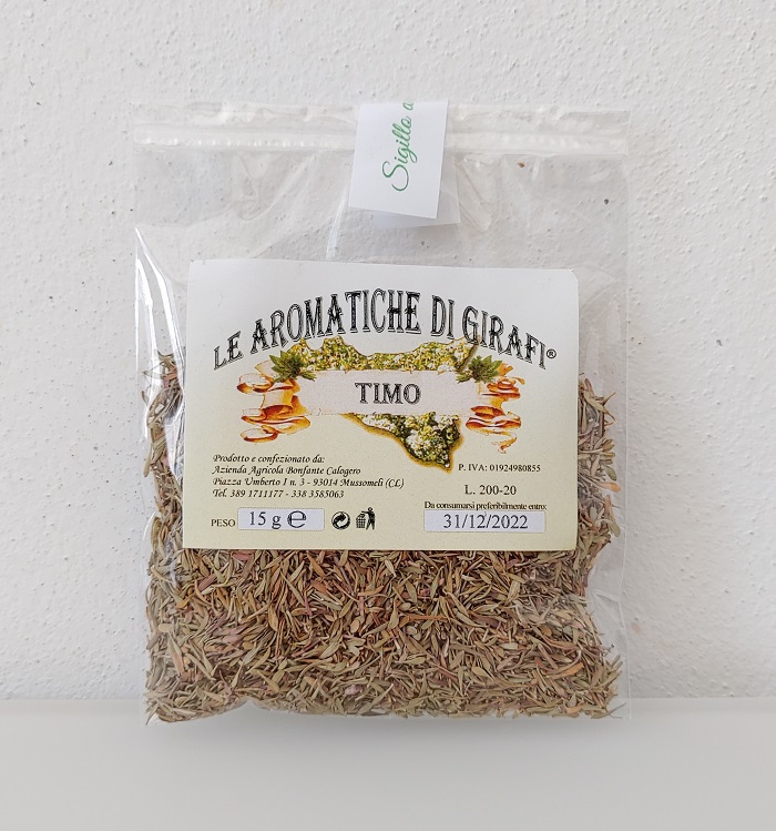 Timo coltivato in pieno campo senza uso di prodotti chimici tra 700 e 900m di altitudine sulle montagne di Mussomeli (Caltanisetta), raccolto a mano ed essiccato al sole.