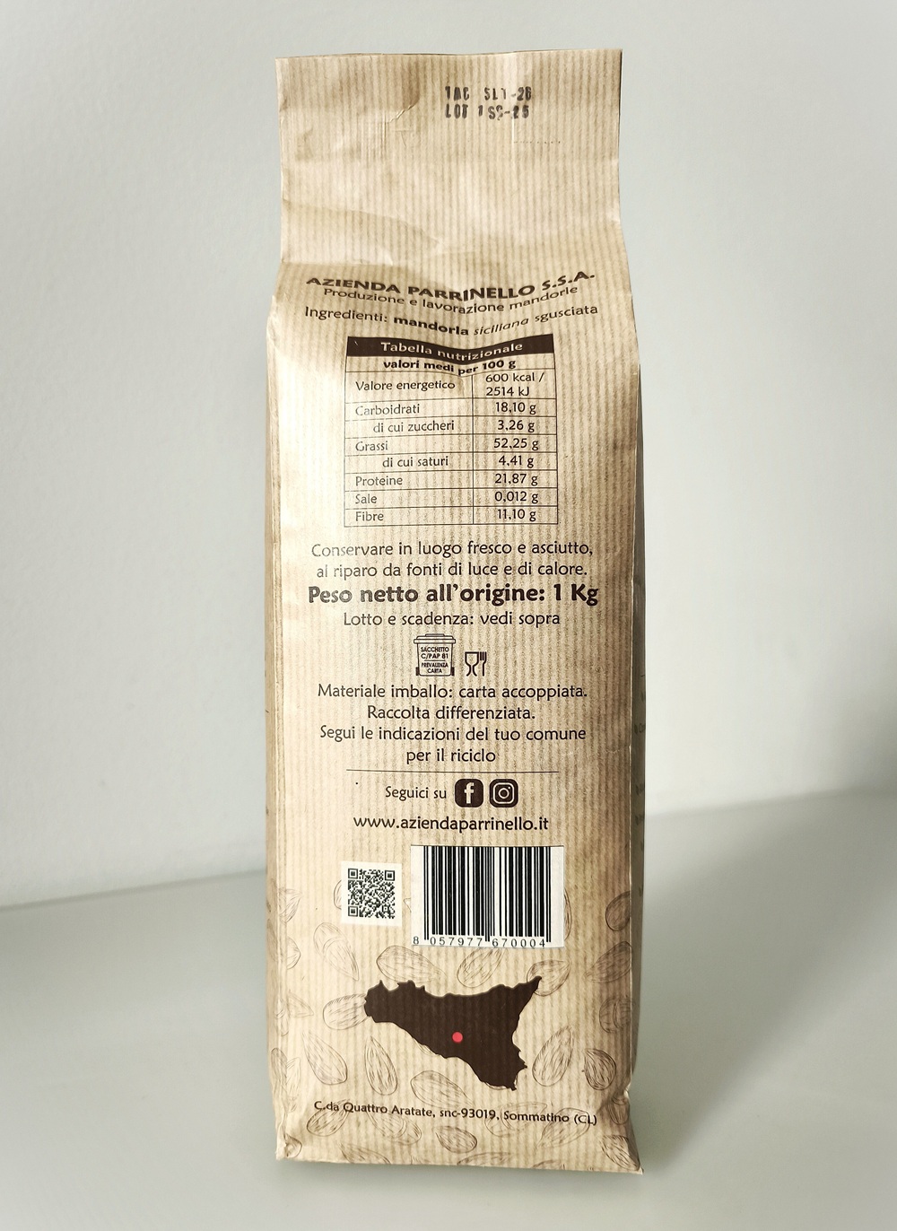 La mandorla, appena raccolta, viene immediatamente smallata e posta ad asciugare per ridurre al minimo il rischio di formazione di micotossine. Successivamente viene privata del guscio, calibrata e selezionata per avere una mandorla intera dal calibro 36+.